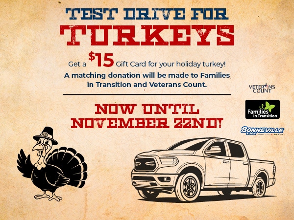 Here at Bonneville & Son Chrysler Dodge Jeep Ram, we're holding the Test Drive for Turkeys event at the dealership, now through November 22.