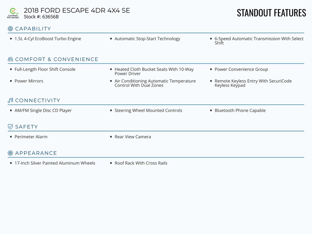 Standout features of this Certified-Go Pre-Owned 2018 FORD ESCAPE 4DR 4X4 SE include: