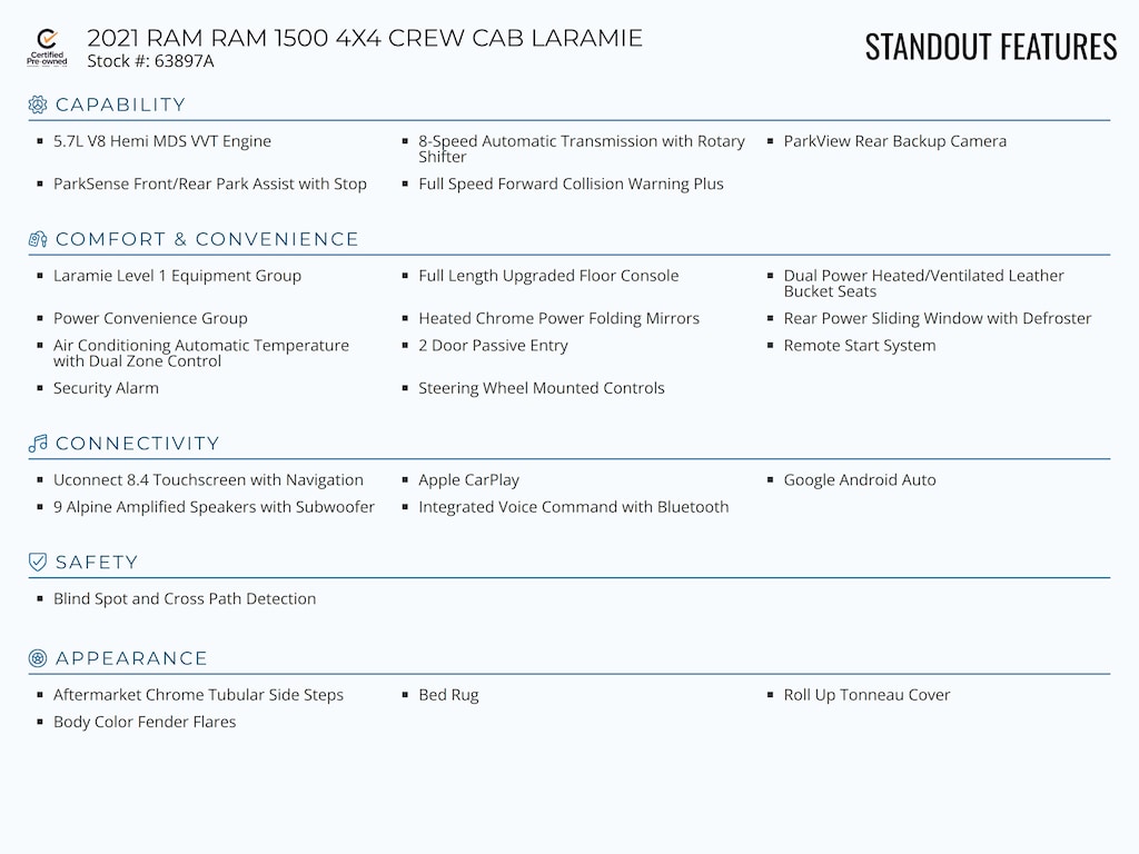 Standout features of this Certified Pre-Owned 2021 RAM RAM 1500 4X4 CREW CAB LARAMIE include: