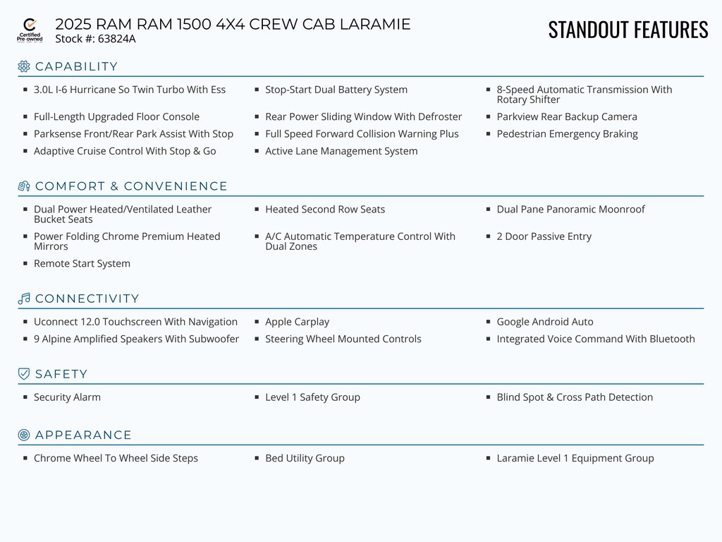 Standout features of this Certified Pre-Owned 2025 RAM RAM 1500 4X4 CREW CAB LARAMIE include: