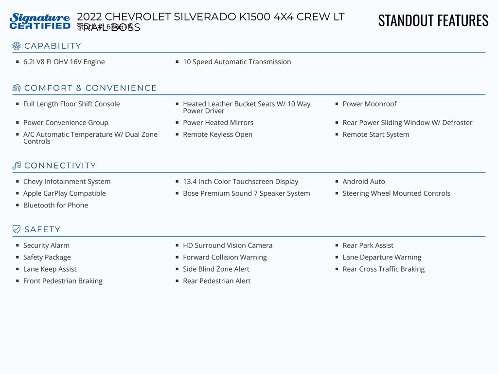 Standout features of this Signature Certified 2022 CHEVROLET SILVERADO K1500 4X4 CREW LT TRAIL BOSS include: