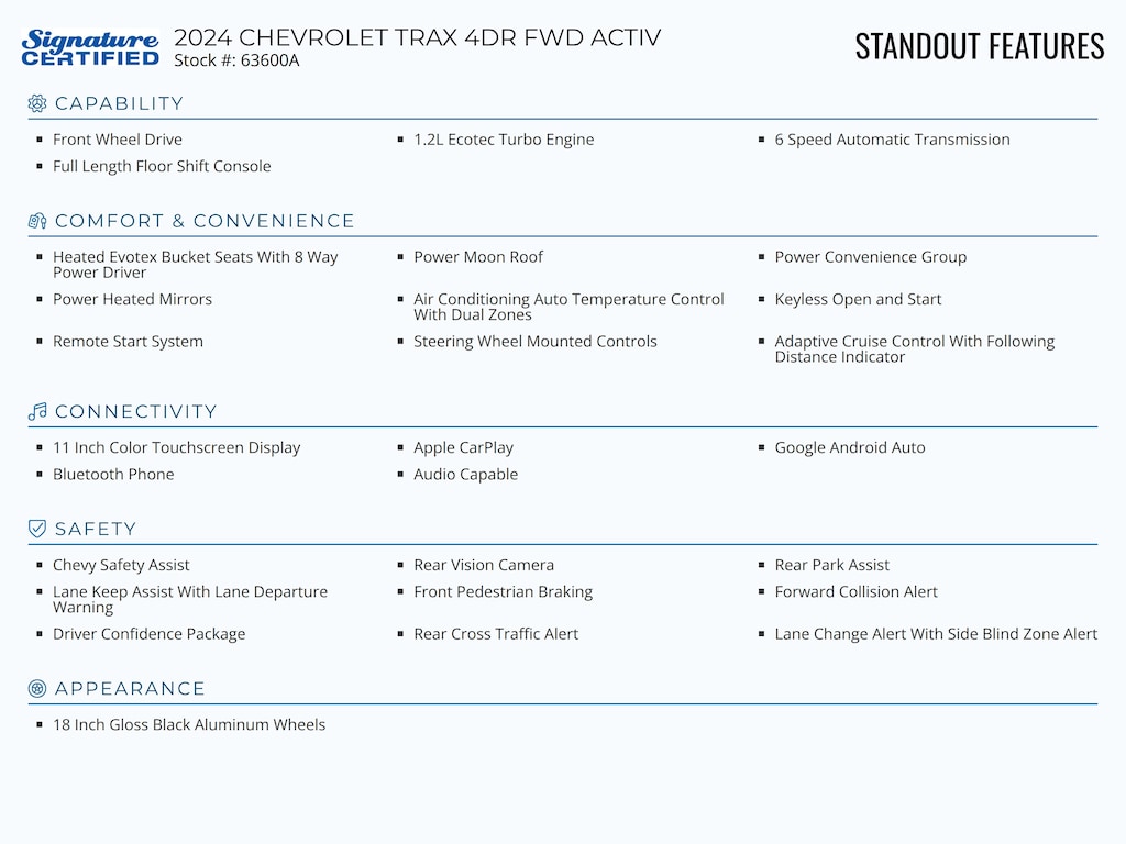 Standout features of this Signature Certified 2024 CHEVROLET TRAX 4DR FWD ACTIV include: