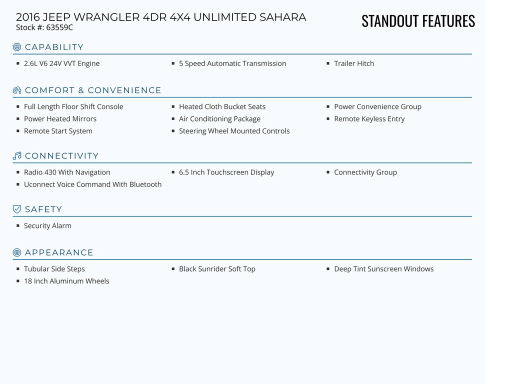 Standout features of this 2016 JEEP WRANGLER 4DR 4X4 UNLIMITED SAHARA include: