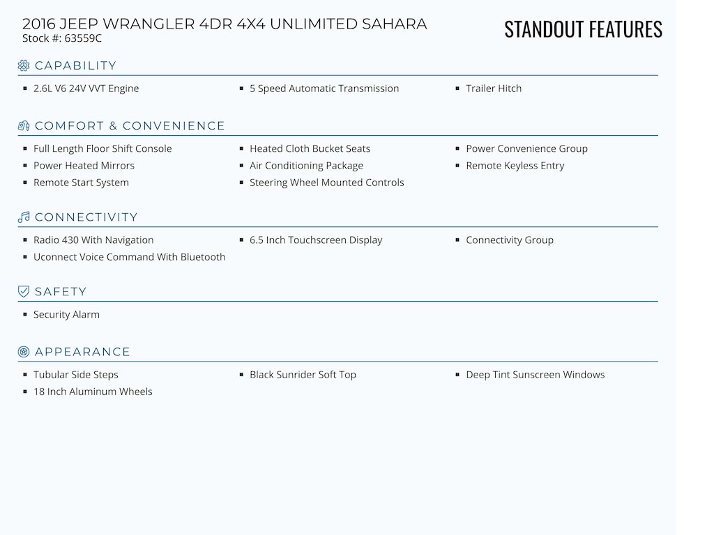 Standout features of this 2016 JEEP WRANGLER 4DR 4X4 UNLIMITED SAHARA include: