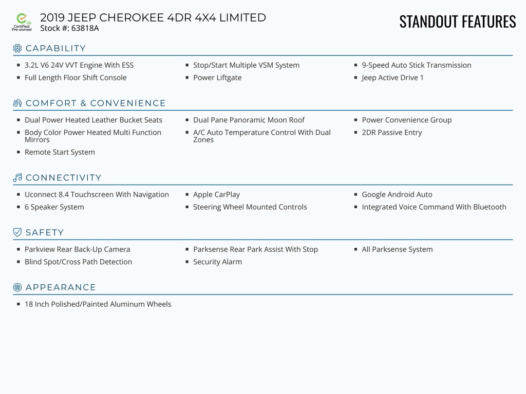 Standout features of this Certified-Go Pre-Owned 2019 JEEP CHEROKEE 4DR 4X4 LIMITED include: