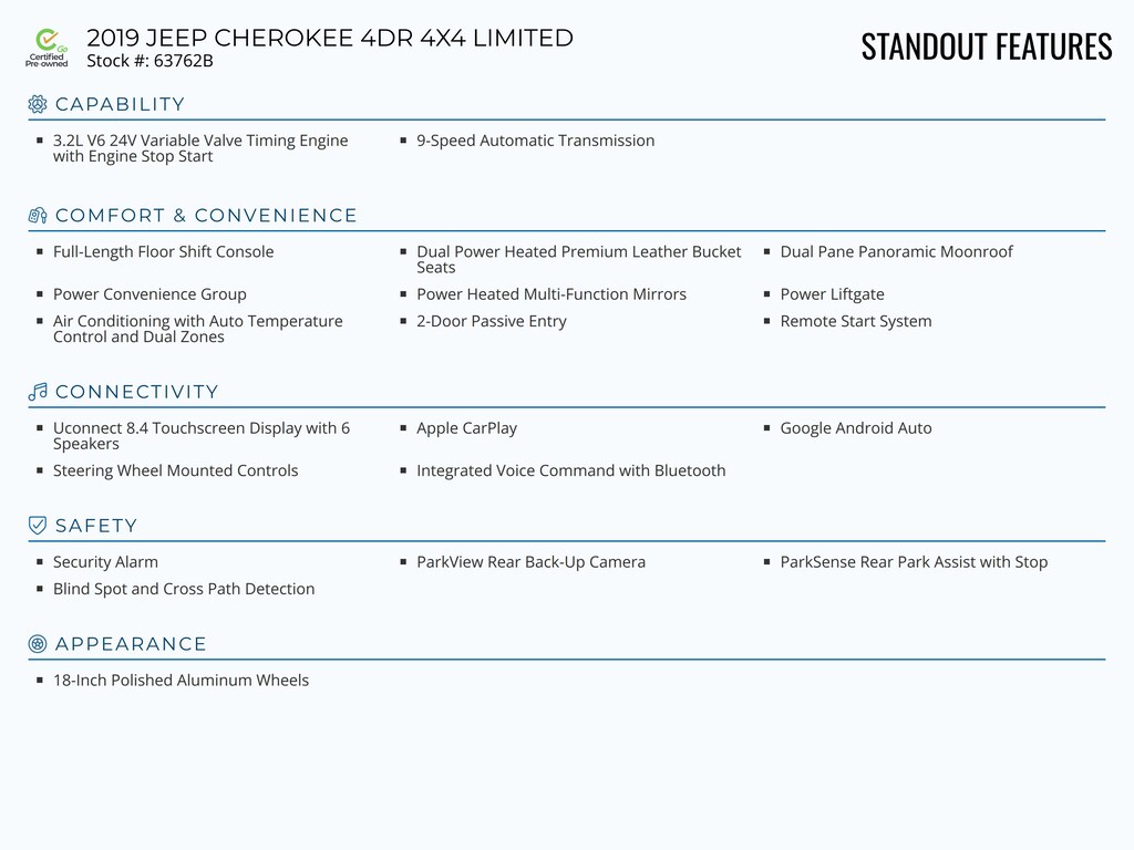 Standout features of this Certified-Go Pre-Owned 2019 JEEP CHEROKEE 4DR 4X4 LIMITED include: