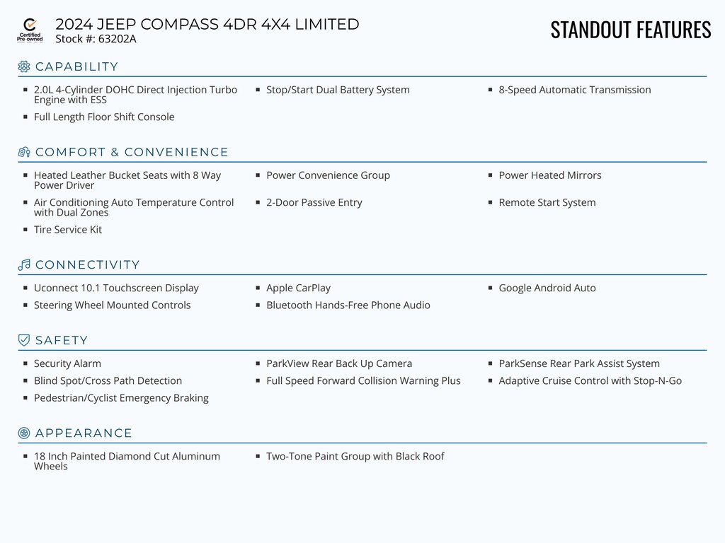 Standout features of this Certified Pre-Owned 2024 JEEP COMPASS 4DR 4X4 LIMITED include: