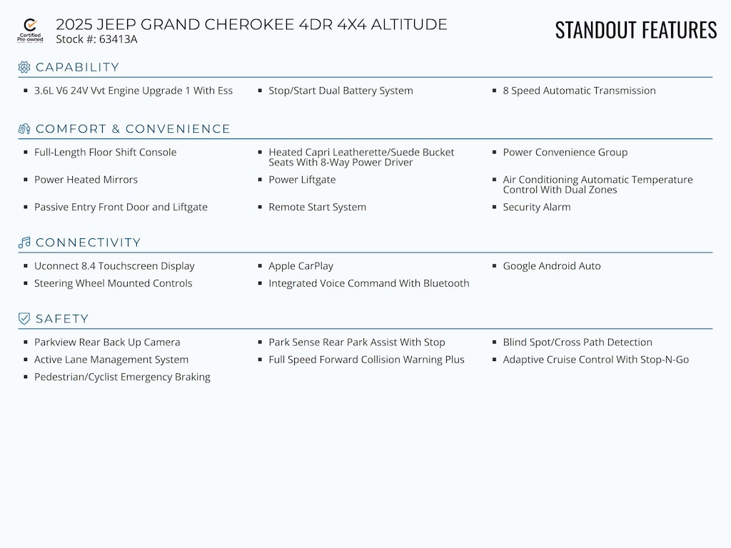 Standout features of this Certified Pre-Owned 2025 JEEP GRAND CHEROKEE 4DR 4X4 ALTITUDE include: