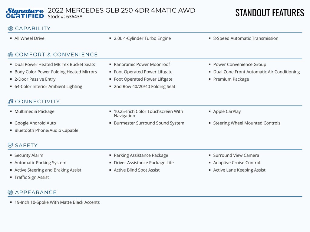 Standout features of this Signature Certified 2022 MERCEDES GLB 250 4DR 4MATIC AWD include: