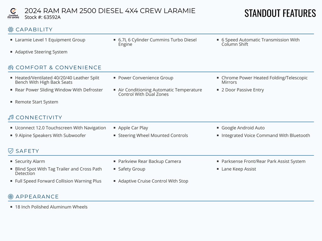 Standout features of this Certified Pre-Owned 2024 RAM RAM 2500 DIESEL 4X4 CREW LARAMIE include:
